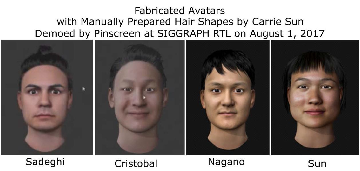 216. Pinscreen’s public demo at SIGGRAPH 2017 RTL, titled “Pinscreen: Creating Performance-Driven Avatars in Seconds” was co-presented by Li, Sadeghi, Nagano, Seo, and Sun and contained fabricated avatars with manually prepared hair shapes. This demo is published on ACM digital library and ACM SIGGRAPH’s YouTube channel: