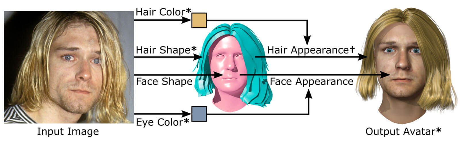 56. The following diagram demonstrates subprocesses of Pinscreen’s avatar generation technology which are relevant to this complaint. Subprocesses marked with an asterisk ( * ) are among the ones that Pinscreen has misrepresented. The Hair Appearance subprocess, marked with an obelisk ( † ), is within Sadeghi’s expertise and was significantly improved by his contributions: